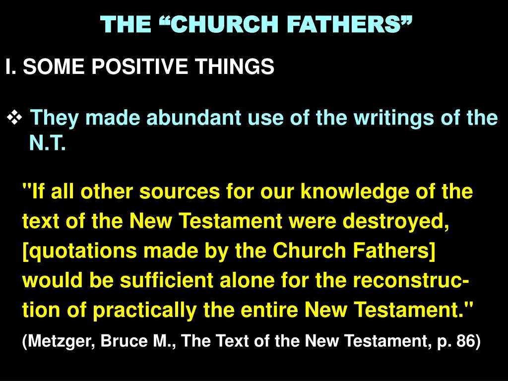 THE “CHURCH FATHERS” • I. SOME POSITIVE THINGS • They made abundant use of the writings of the N.T. "If all other sources for our knowledge of the text of the New Testament were destroyed, [quotations made by the Church Fathers] would be sufficient alone for the reconstruc- tion of practically the entire New Testament." (Metzger, Bruce M., The Text of the New Testament, p. 86)