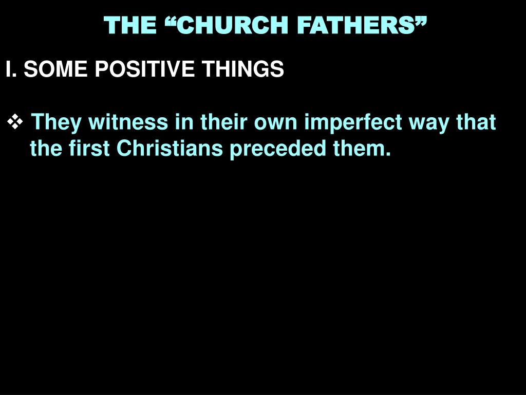 THE “CHURCH FATHERS” • I. SOME POSITIVE THINGS • They witness in their own imperfect way that the first Christians preceded them.