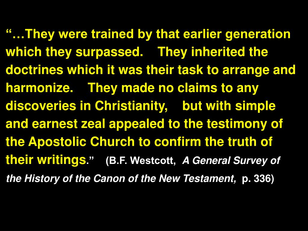 “…They were trained by that earlier generation which they surpassed. They inherited the doctrines which it was their task to arrange and harmonize. They made no claims to any discoveries in Christianity, but with simple and earnest zeal appealed to the testimony of the Apostolic Church to confirm the truth of their writings.” (B.F. Westcott, A General Survey of the History of the Canon of the New Testament, p. 336)