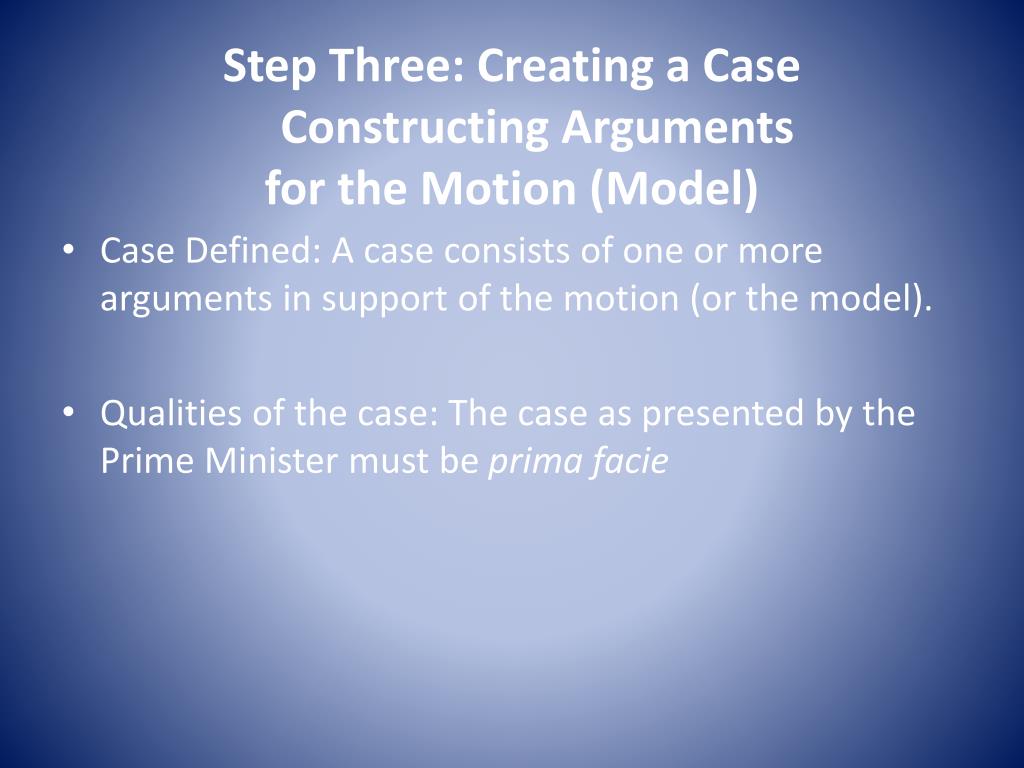 Step Three: Creating a Case Constructing Arguments for the Motion (Model) • Case Defined: A case consists of one or more arguments in support of the motion (or the model). • Qualities of the case: The case as presented by the Prime Minister must be prima facie