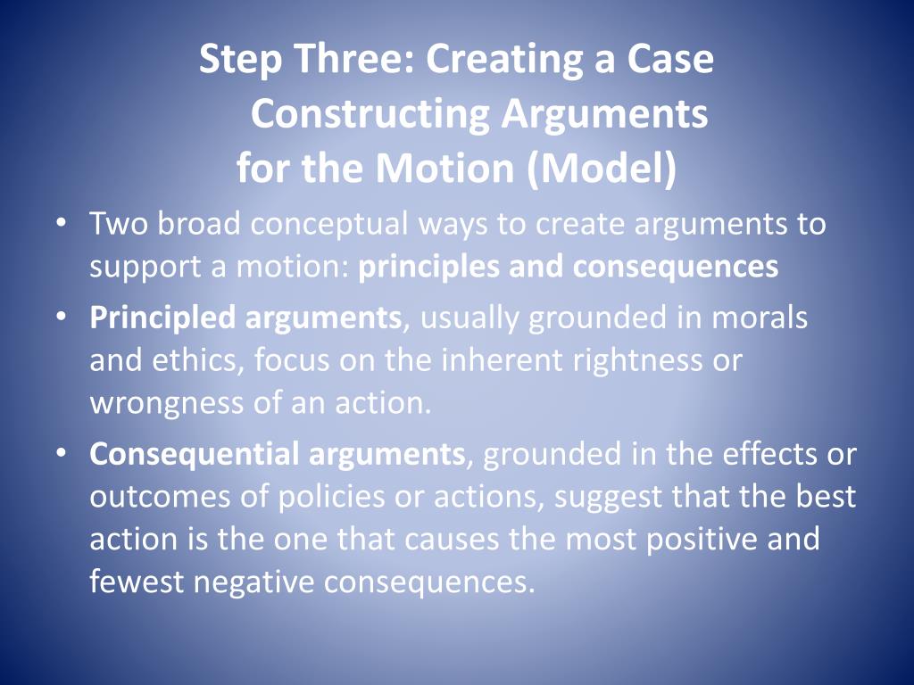 Step Three: Creating a Case Constructing Arguments for the Motion (Model) • Two broad conceptual ways to create arguments to support a motion: principles and consequences • Principled arguments, usually grounded in morals and ethics, focus on the inherent rightness or wrongness of an action. • Consequential arguments, grounded in the effects or outcomes of policies or actions, suggest that the best action is the one that causes the most positive and fewest negative consequences.