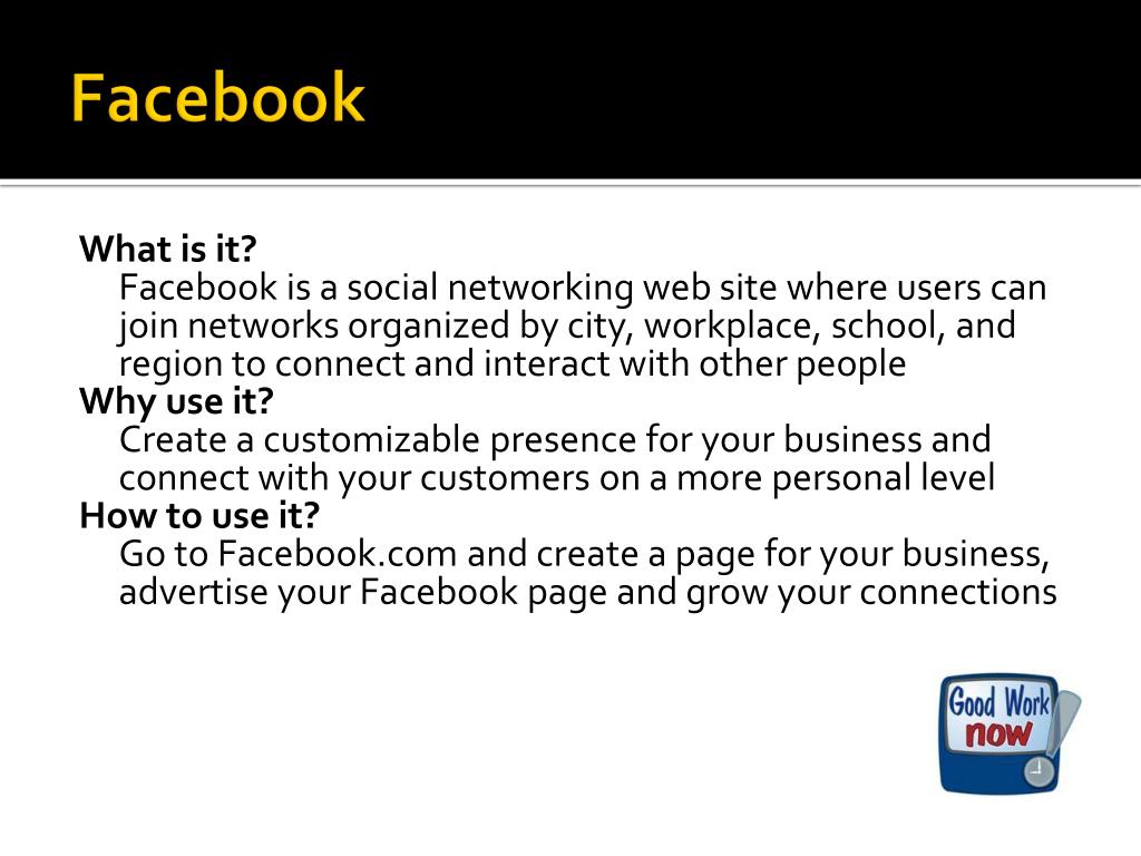 Facebook What is it? Facebook is a social networking web site where users can join networks organized by city, workplace, school, and region to connect and interact with other people Why use it? Create a customizable presence for your business and connect with your customers on a more personal level How to use it? Go to Facebook.com and create a page for your business, advertise your Facebook page and grow your connections
