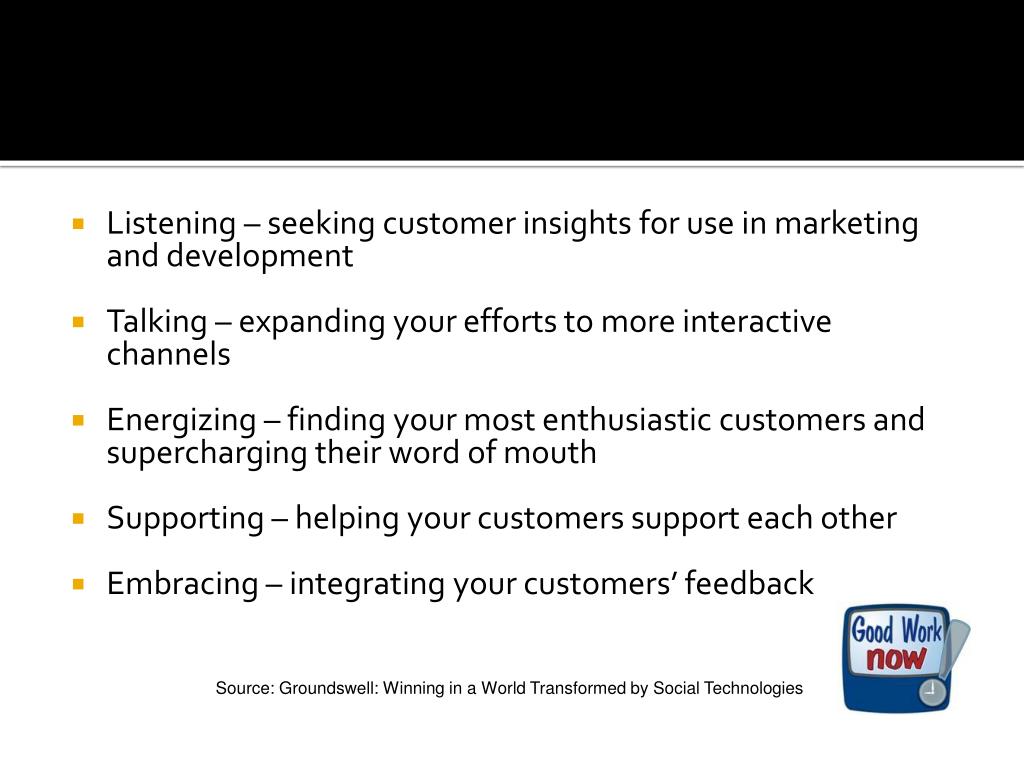 Listening – seeking customer insights for use in marketing and development • Talking – expanding your efforts to more interactive channels • Energizing – finding your most enthusiastic customers and supercharging their word of mouth • Supporting – helping your customers support each other • Embracing – integrating your customers’ feedback Source: Groundswell: Winning in a World Transformed by Social Technologies