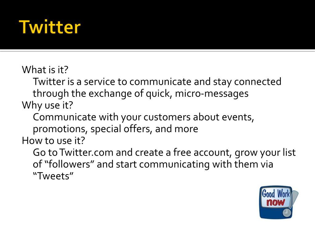 Twitter What is it? Twitter is a service to communicate and stay connected through the exchange of quick, micro-messages Why use it? Communicate with your customers about events, promotions, special offers, and more How to use it? Go to Twitter.com and create a free account, grow your list of “followers” and start communicating with them via “Tweets”