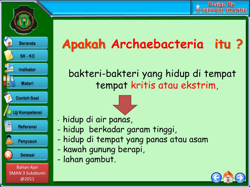 ApakahArchaebacteriaitu ? bakteri-bakteri yang hidupditempattempatkritisatauekstrim, - hidup di air panas, - hidup berkadar garam tinggi, - hidup di tempat yang panas atau asam - kawah gunung berapi, - lahan gambut.