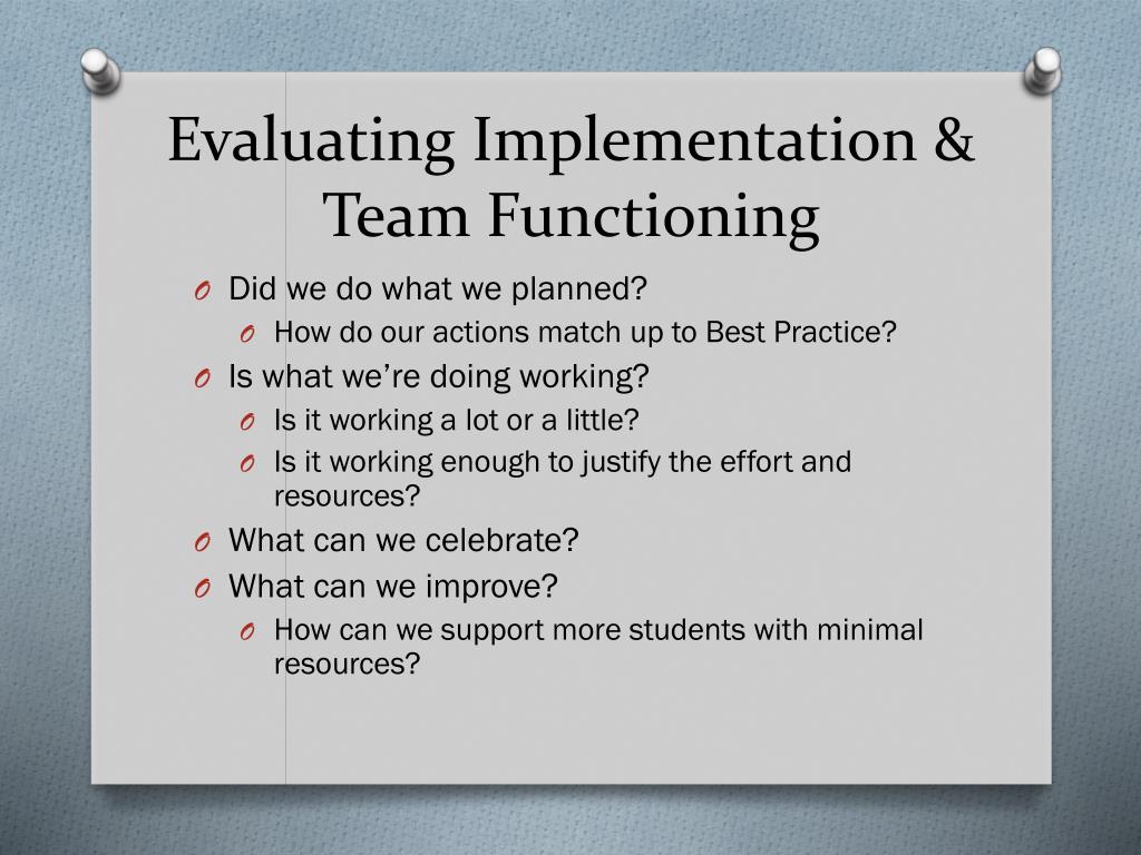 Evaluating Implementation & Team Functioning • Did we do what we planned? • How do our actions match up to Best Practice? • Is what we’re doing working? • Is it working a lot or a little? • Is it working enough to justify the effort and resources? • What can we celebrate? • What can we improve? • How can we support more students with minimal resources?