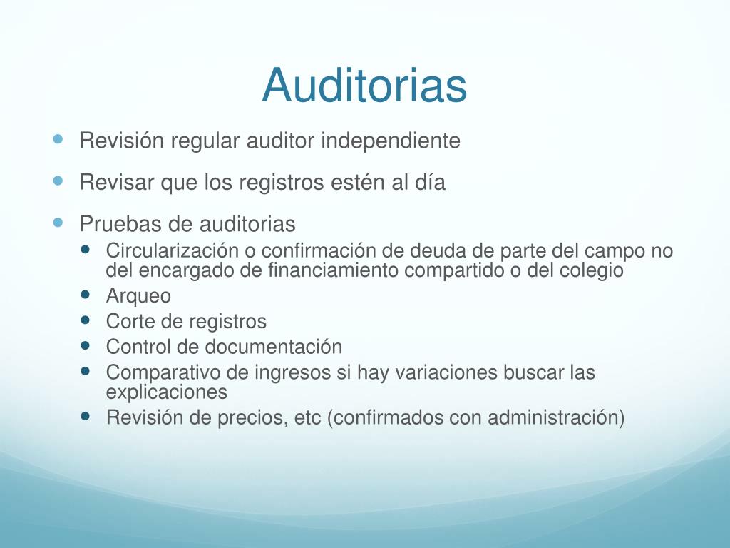 Auditorias • Revisión regular auditor independiente • Revisar que los registros estén al día • Pruebas de auditorias • Circularización o confirmación de deuda de parte del campo no del encargado de financiamiento compartido o del colegio • Arqueo • Corte de registros • Control de documentación • Comparativo de ingresos si hay variaciones buscar las explicaciones • Revisión de precios, etc (confirmados con administración)