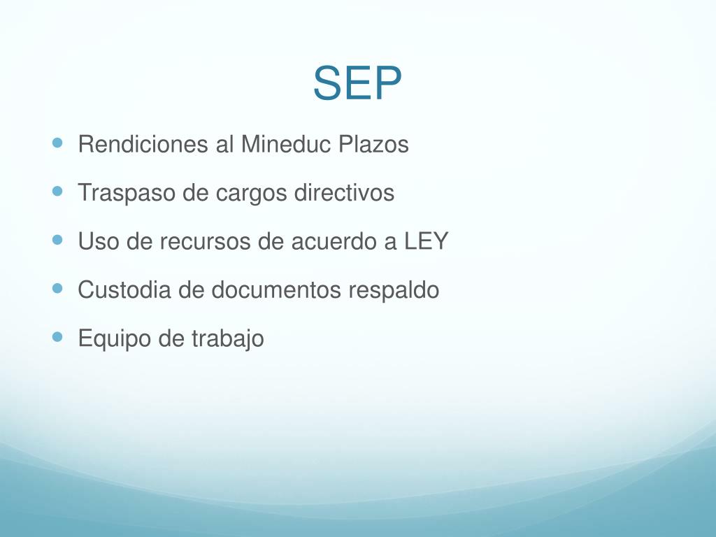 SEP • Rendiciones al Mineduc Plazos • Traspaso de cargos directivos • Uso de recursos de acuerdo a LEY • Custodia de documentos respaldo • Equipo de trabajo