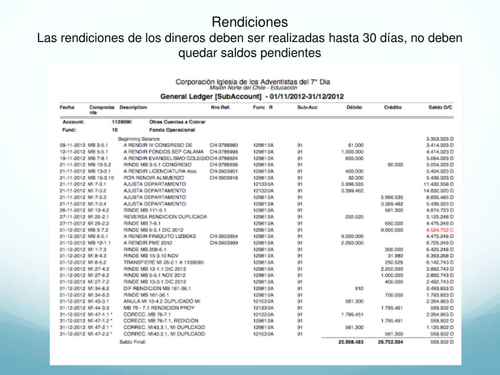 Rendiciones Las rendiciones de los dineros deben ser realizadas hasta 30 días, no deben quedar saldos pendientes