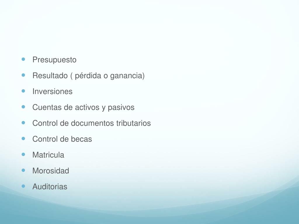 Presupuesto • Resultado ( pérdida o ganancia) • Inversiones • Cuentas de activos y pasivos • Control de documentos tributarios • Control de becas • Matricula • Morosidad • Auditorias