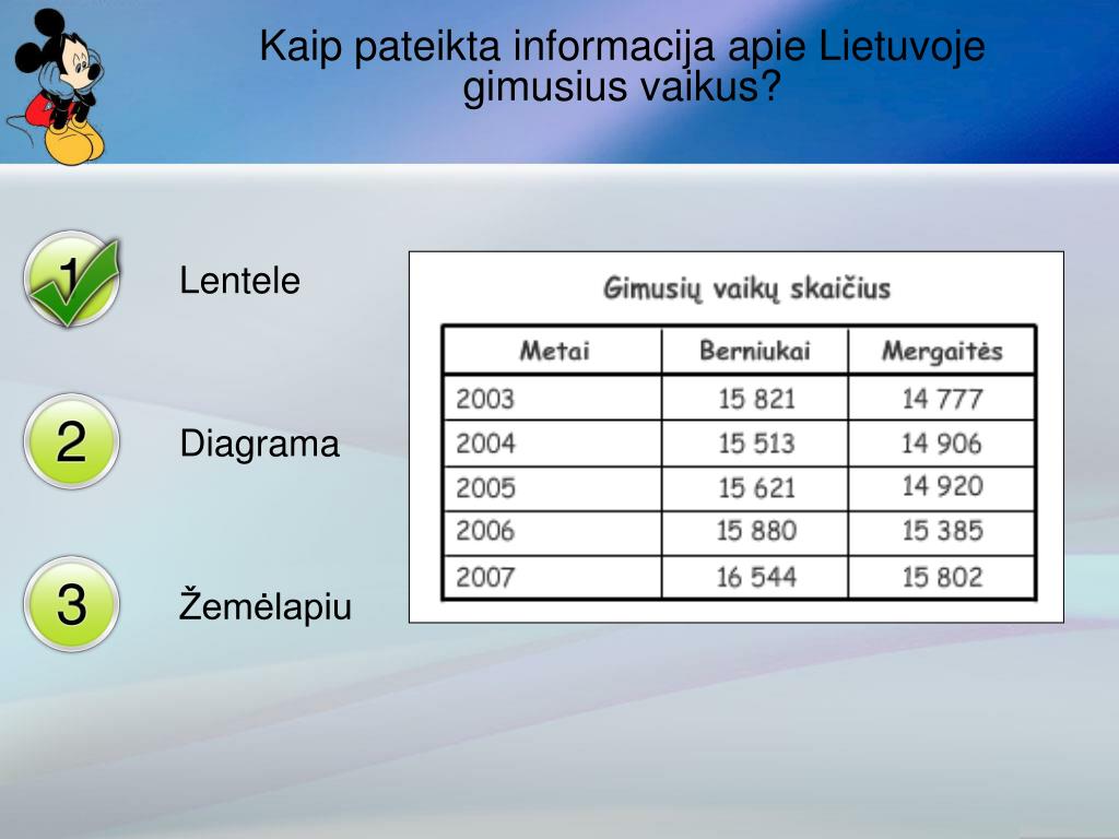 Surinkus, sutvarkius duomenis yra gaunama statistinė informacija. Ji gali būti pateikta: (pažymėk, kas netinka) lentele diagrama eilėraščiu žemėlapiu