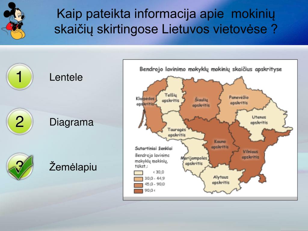 Kaip pateikta informacija apie mokinių skaičių skirtingose Lietuvos vietovėse ? Lentele Diagrama Žemėlapiu