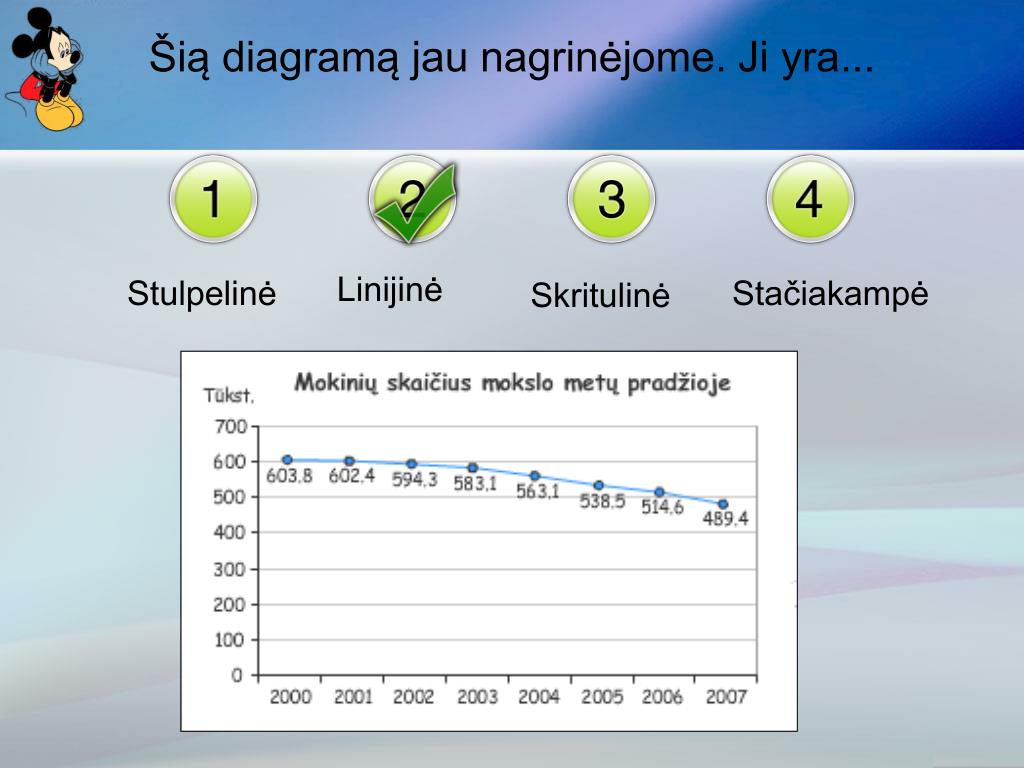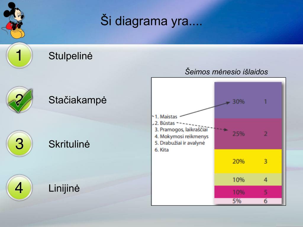 Šią diagramą jau nagrinėjome. Ji yra... Stulpelinė Linijinė Skritulinė Stačiakampė