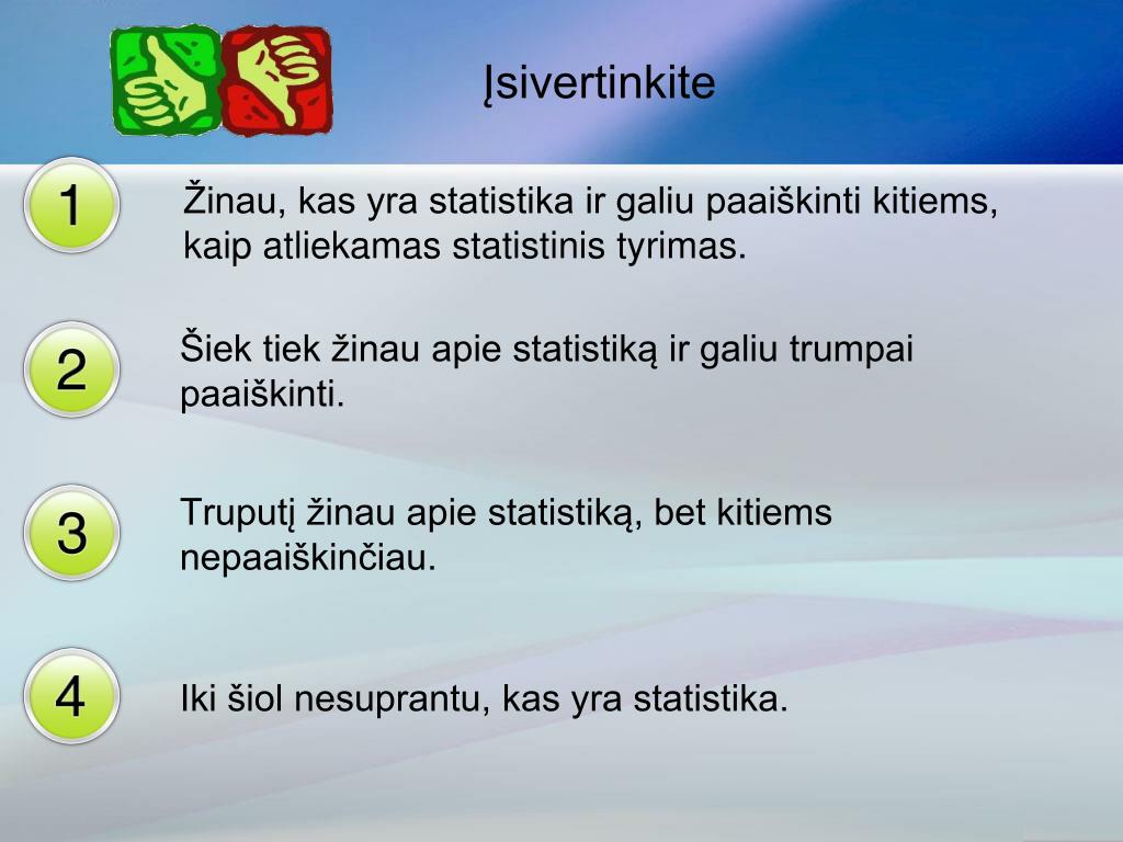 Įsivertinkite Žinau, kas yra statistika ir galiu paaiškinti kitiems, kaip atliekamas statistinis tyrimas. Šiek tiek žinau apie statistiką ir galiu trumpai paaiškinti. Truputį žinau apie statistiką, bet kitiems nepaaiškinčiau. Iki šiol nesuprantu, kas yra statistika.