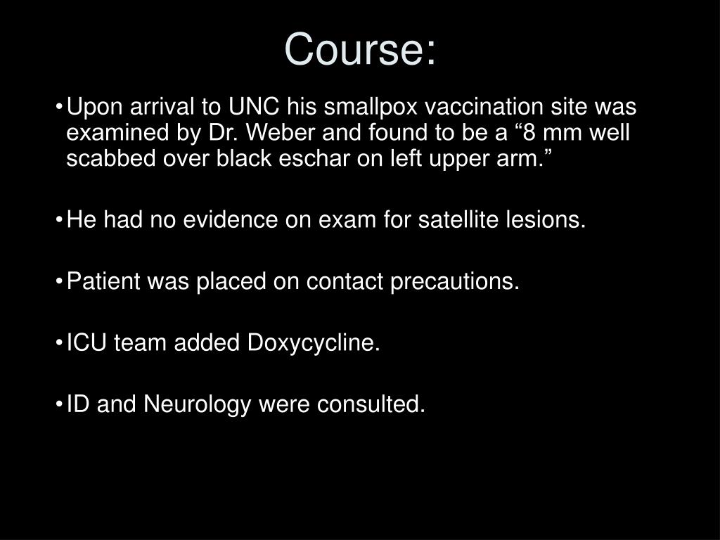 Course: • Upon arrival to UNC his smallpox vaccination site was examined by Dr. Weber and found to be a “8 mm well scabbed over black eschar on left upper arm.” • He had no evidence on exam for satellite lesions. • Patient was placed on contact precautions. • ICU team added Doxycycline. • ID and Neurology were consulted.