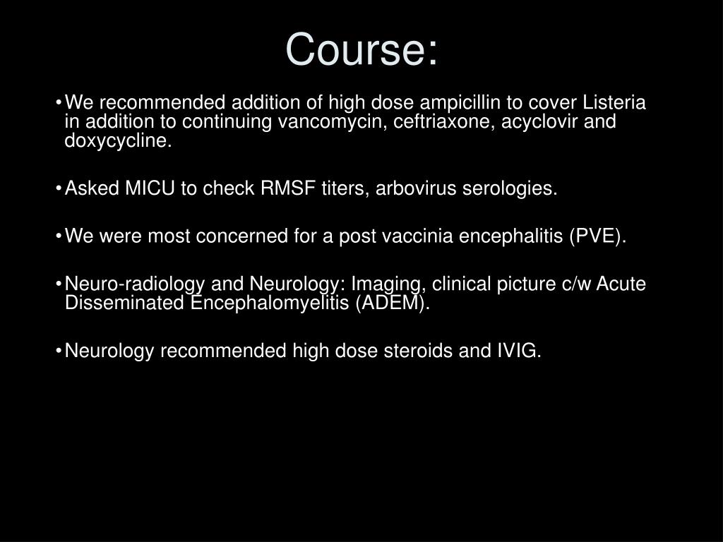 Course: • We recommended addition of high dose ampicillin to cover Listeria in addition to continuing vancomycin, ceftriaxone, acyclovir and doxycycline. • Asked MICU to check RMSF titers, arbovirus serologies. • We were most concerned for a post vaccinia encephalitis (PVE). • Neuro-radiology and Neurology: Imaging, clinical picture c/w Acute Disseminated Encephalomyelitis (ADEM). • Neurology recommended high dose steroids and IVIG.