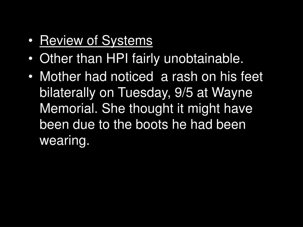 Review of Systems • Other than HPI fairly unobtainable. • Mother had noticed a rash on his feet bilaterally on Tuesday, 9/5 at Wayne Memorial. She thought it might have been due to the boots he had been wearing.