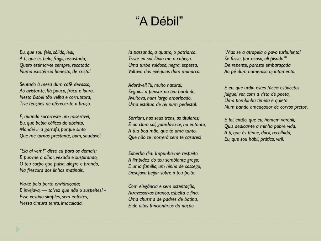 Tema e assunto do poema (análise formal): Tema: “A Débil” Neste poema, o amor é uma projeção num tempo condicional, um projeto para o futuro, o desejo de uma vida diferente radicado na observação presente da cidade corrupta. O narrador parece ter já sucumbido completamente à influência corruptora da cidade. Análise formal . • Expressividade da linguagemMétrica: • versos decassílabos; • Rima: emparelhada e interpolada (ABBA); • Ritmo: ternário; • Sonoridades: aliterações, ecos rimáticos, etc.; • Adjetivações: triplas e duplas • Tipos de frases: declarativas; • Antíteses: feio/bela; • Metáforas.