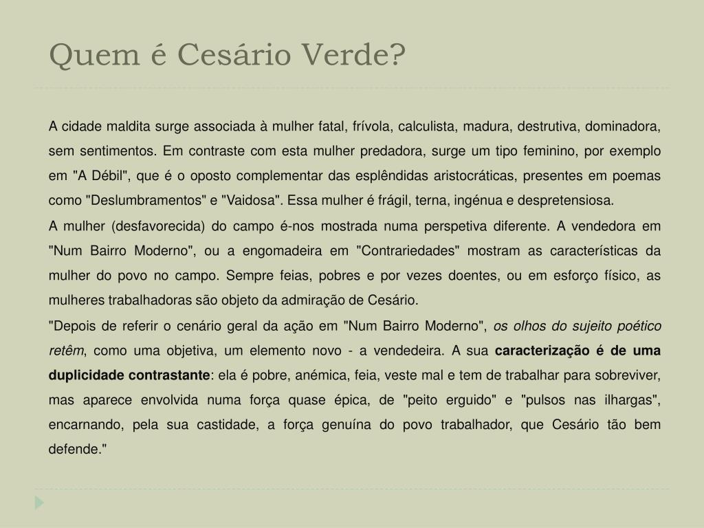 Quem é Cesário Verde? José Joaquim Cesário Verde (Lisboa, 25 de Fevereiro de 1855 — Lumiar, 19 de Julho de 1886) foi um poeta português, sendo considerado um dos precursores da poesia que seria feita em Portugal no século XX. Filho do lavrador e comerciante José Anastácio Verde e de Maria da Piedade dos Santos Verde, Cesário matriculou-se no Curso Superior de Letras em 1873, mas apenas o frequentou alguns meses. Ali conheceu Silva Pinto, que ficou seu amigo para o resto da vida. Dividia-se entre a produção de poesias (publicadas em jornais) e as atividades de comerciante herdadas do pai. Em 1877 começou a ter sintomas de tuberculose, doença que já lhe tirara o irmão e a irmã. Estas mortes inspiraram contudo um de seus principais poemas, Nós (1884). Tenta curar-se da tuberculose, mas sem sucesso, vem a falecer no dia 19 de Julho de 1886. No ano seguinte Silva Pinto organiza O Livro de Cesário Verde, compilação da sua poesia publicada em 1901. No seu estilo delicado, Cesário empregou técnicas impressionistas, com extrema sensibilidade ao retratar a Cidade e o Campo, que são os seus cenários prediletos. Evitou o lirismo tradicional, expressando-se de uma forma mais natural. Deambulando pelos dois espaços, depara com dois tipos de mulher, que estão articulados com os locais.