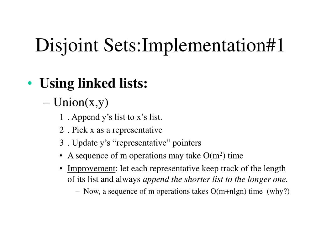 Disjoint sets -- implementation In the discussion that follows: • n is the total number of elements (in all sets). • m is the total number of operations performed
