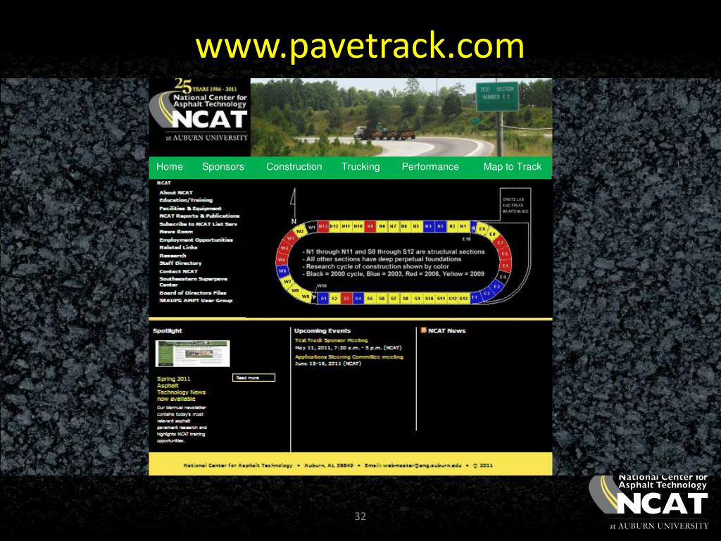 NCAT Pavement Test Track. Welcome to the 5/11/11 Track Sponsor Meeting The meeting will begin at 7:30 central time . Morning Agenda. Operations & field performance by Buzz Powell Structural performance update by Dave Timm Break Durability of PFC Surfaces by Don Watson