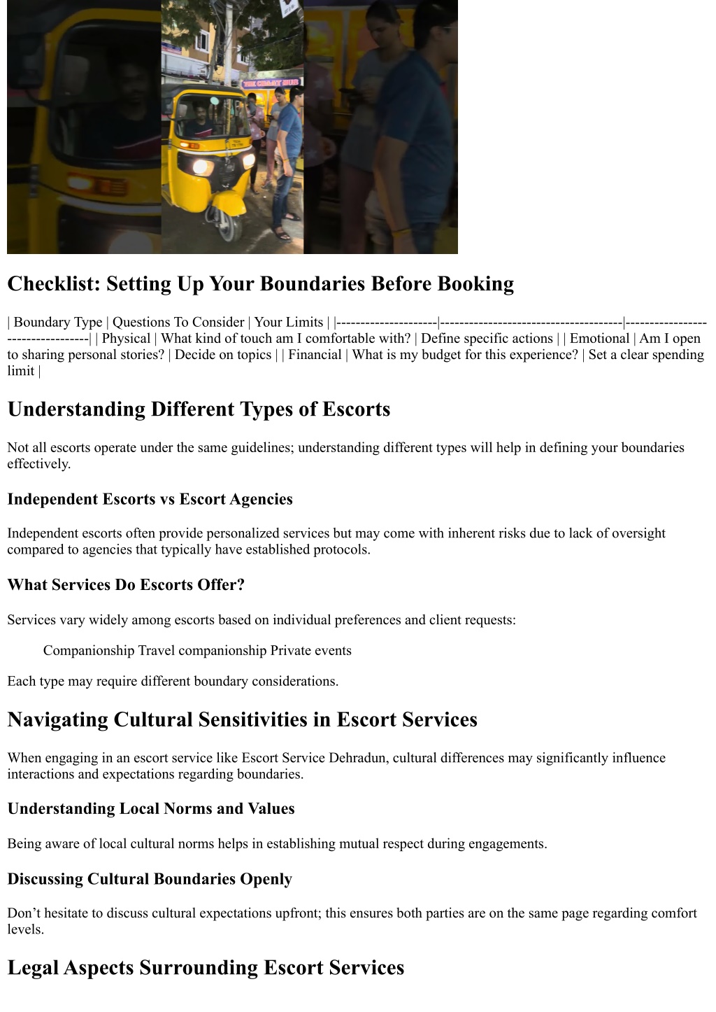 Checklist: Setting Up Your Boundaries Before Booking | Boundary Type | Questions To Consider | Your Limits | |---------------------|--------------------------------------|----------------- -----------------| | Physical | What kind of touch am I comfortable with? | Define specific actions | | Emotional | Am I open to sharing personal stories? | Decide on topics | | Financial | What is my budget for this experience? | Set a clear spending limit | Understanding Different Types of Escorts Not all escorts operate under the same guidelines; understanding different types will help in defining your boundaries effectively. Independent Escorts vs Escort Agencies Independent escorts often provide personalized services but may come with inherent risks due to lack of oversight compared to agencies that typically have established protocols. What Services Do Escorts Offer? Services vary widely among escorts based on individual preferences and client requests: Companionship Travel companionship Private events Each type may require different boundary considerations. Navigating Cultural Sensitivities in Escort Services When engaging in an escort service like Escort Service Dehradun, cultural differences may significantly influence interactions and expectations regarding boundaries. Understanding Local Norms and Values Being aware of local cultural norms helps in establishing mutual respect during engagements. Discussing Cultural Boundaries Openly Don’t hesitate to discuss cultural expectations upfront; this ensures both parties are on the same page regarding comfort levels. Legal Aspects Surrounding Escort Services