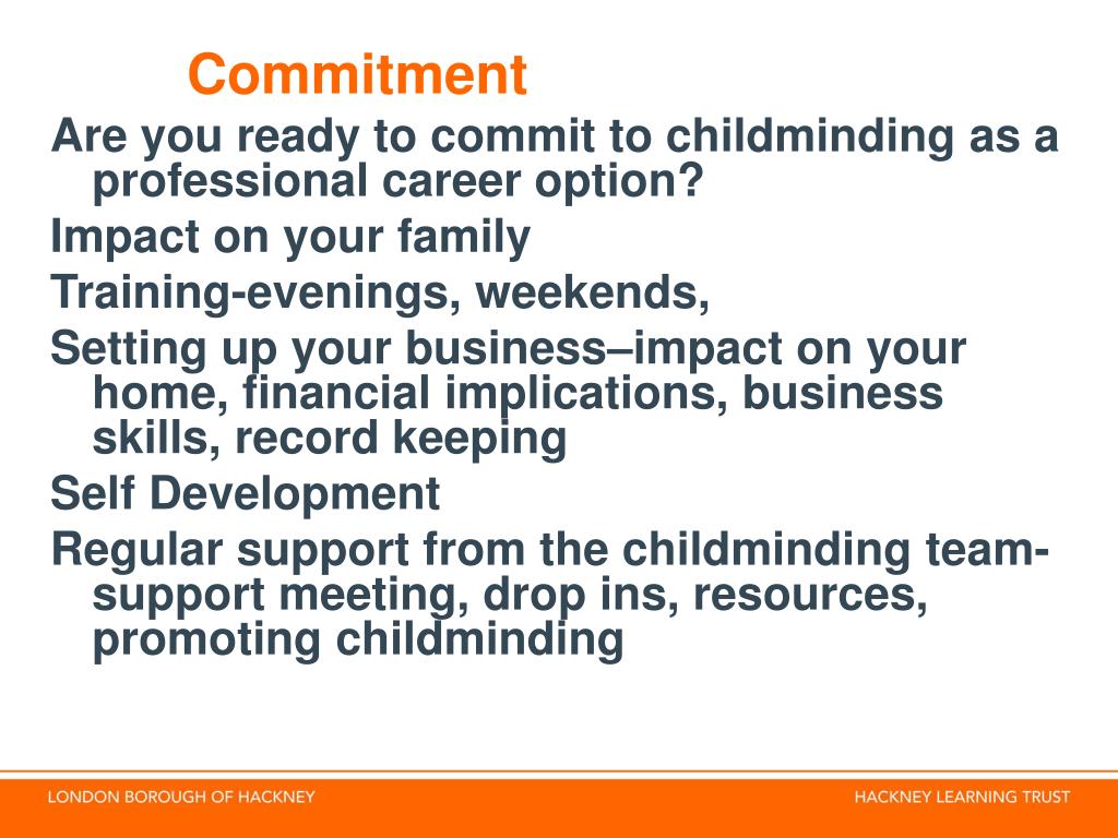 Commitment Are you ready to commit to childminding as a professional career option? Impact on your family Training-evenings, weekends, Setting up your business–impact on your home, financial implications, business skills, record keeping Self Development Regular support from the childminding team-support meeting, drop ins, resources, promoting childminding