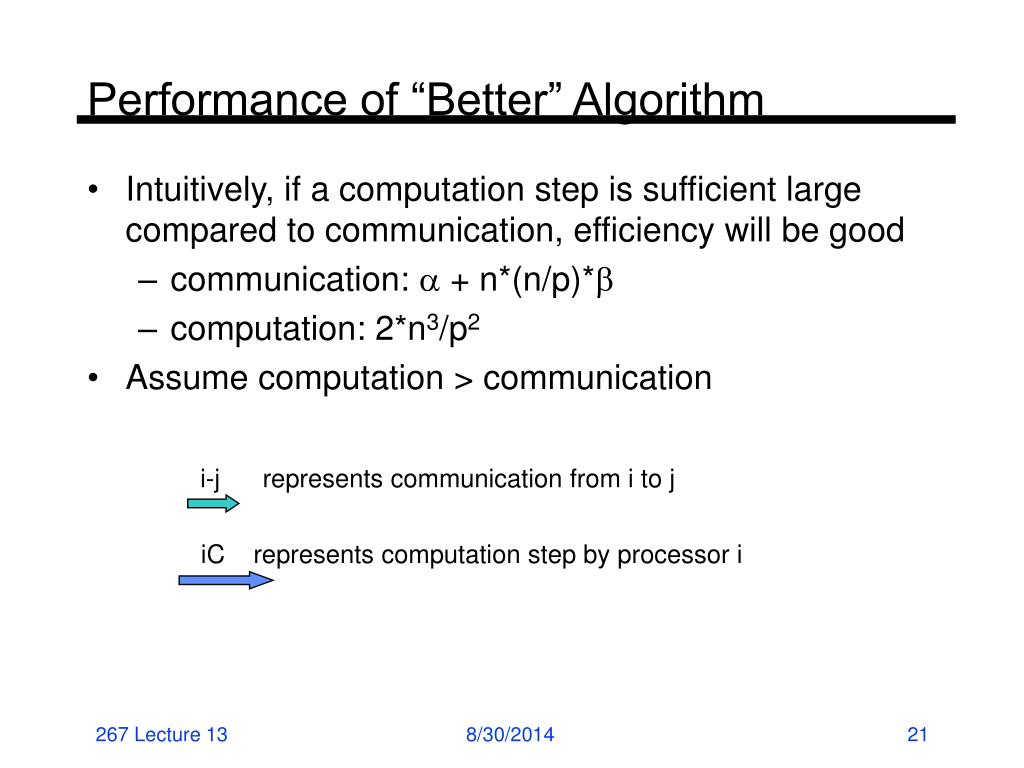 Performance of “Better” Algorithm • Intuitively, if a computation step is sufficient large compared to communication, efficiency will be good • communication: a + n*(n/p)*b • computation: 2*n3/p2 • Assume computation > communication i-j represents communication from i to j iC represents computation step by processor i