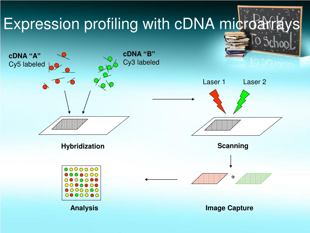 Expression profiling with cDNA microarrays cDNA “B” Cy3 labeled cDNA “A” Cy5 labeled Laser 1 Laser 2 Scanning Hybridization + Analysis Image Capture