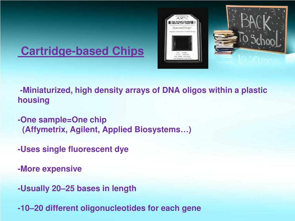 Cartridge-based Chips -Miniaturized, high density arrays of DNA oligos within a plastic housing-One sample=One chip (Affymetrix, Agilent, Applied Biosystems…)-Uses single fluorescent dye-More expensive-Usually 20–25 bases in length-10–20 different oligonucleotides for each gene
