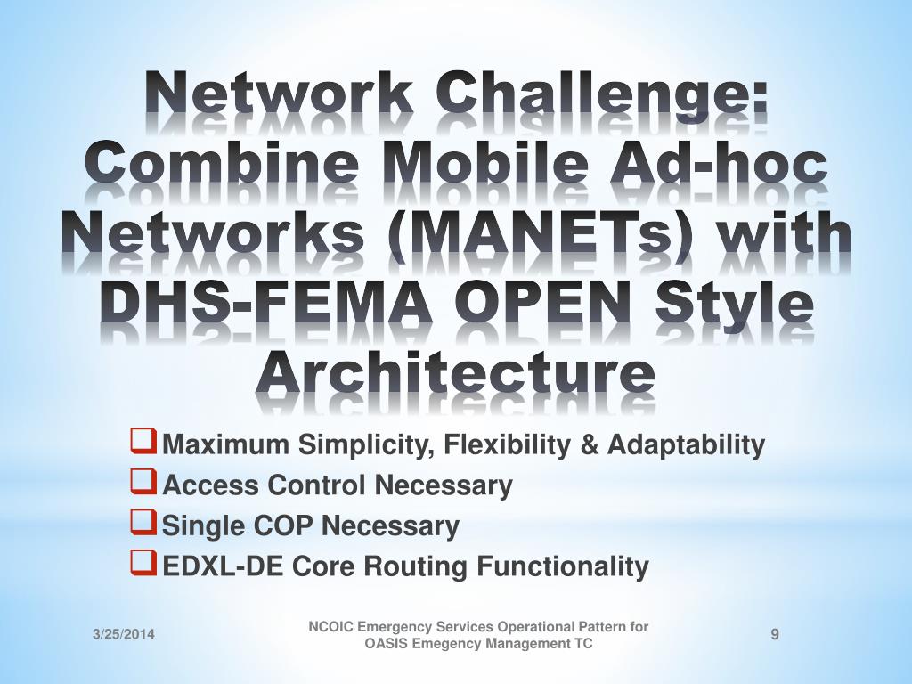 Network Challenge: Combine Mobile Ad-hoc Networks (MANETs) with DHS-FEMA OPEN Style Architecture Maximum Simplicity, Flexibility & Adaptability Access Control Necessary Single COP Necessary EDXL-DE Core Routing Functionality NCOIC Emergency Services Operational Pattern for OASIS Emegency Management TC