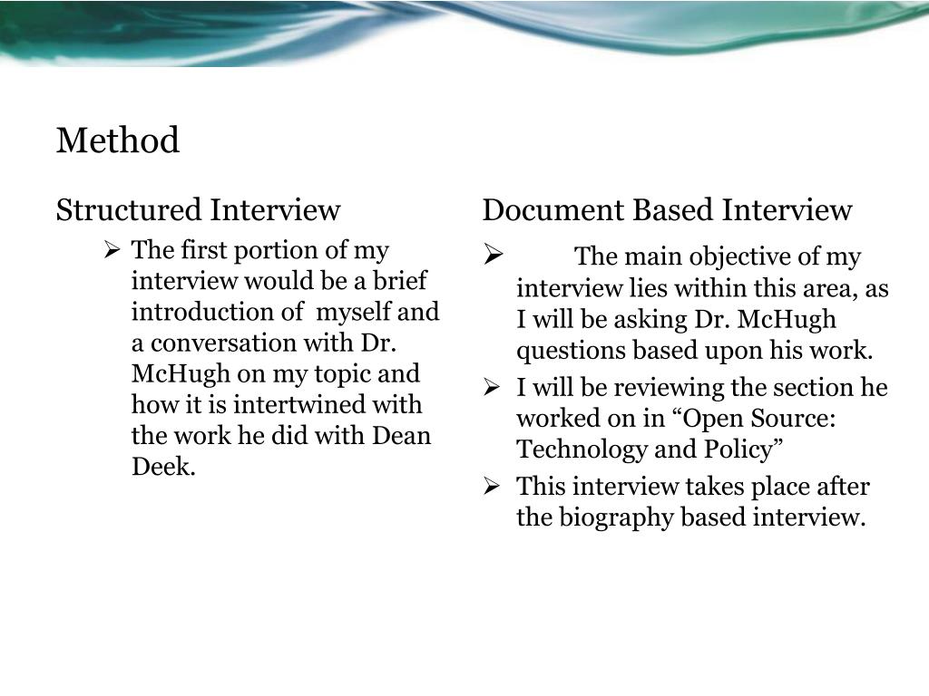 Method Structured Interview • The first portion of my interview would be a brief introduction of myself and a conversation with Dr. McHugh on my topic and how it is intertwined with the work he did with Dean Deek. Document Based Interview • The main objective of my interview lies within this area, as I will be asking Dr. McHugh questions based upon his work. • I will be reviewing the section he worked on in “Open Source: Technology and Policy” • This interview takes place after the biography based interview.