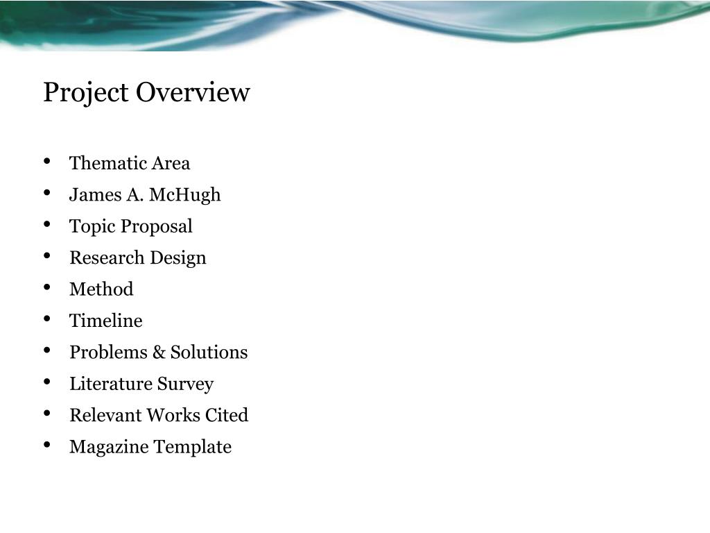 Project Overview • Thematic Area • James A. McHugh • Topic Proposal • Research Design • Method • Timeline • Problems & Solutions • Literature Survey • Relevant Works Cited • Magazine Template