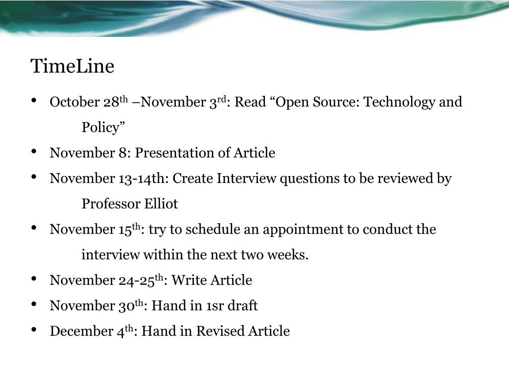 TimeLine • October 28th –November 3rd: Read “Open Source: Technology and Policy” • November 8: Presentation of Article • November 13-14th: Create Interview questions to be reviewed by Professor Elliot • November 15th: try to schedule an appointment to conduct the interview within the next two weeks. • November 24-25th: Write Article • November 30th: Hand in 1sr draft • December 4th: Hand in Revised Article