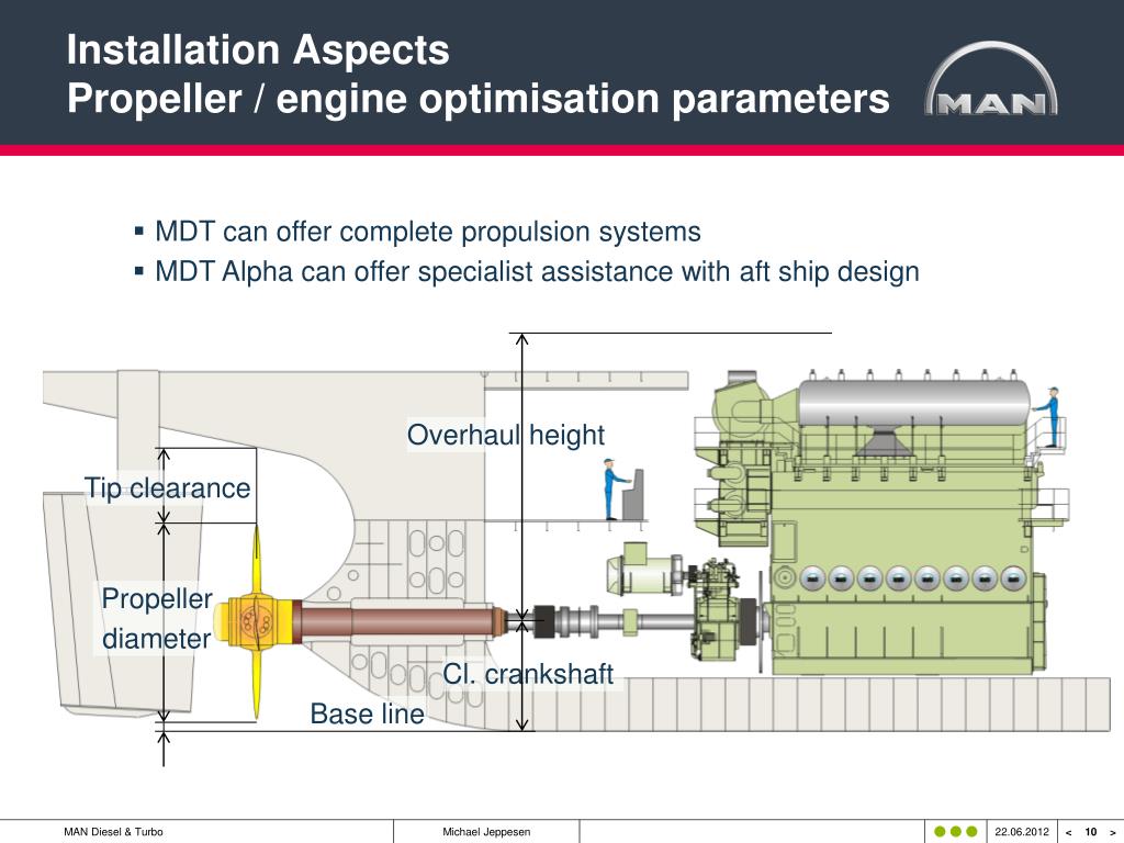 Installation AspectsPropeller / engineoptimisation parameters • MDT can offer complete propulsion systems • MDT Alpha can offer specialist assistance with aft ship design Overhaulheight Tip clearance Propeller diameter Cl. crankshaft Base line