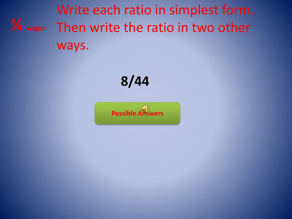 Write each ratio in simplest form. Then write the ratio in two other ways. ¼ wager 8/44 Possible Answers