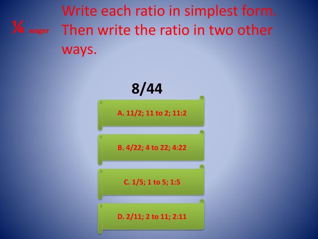 Write each ratio in simplest form. Then write the ratio in two other ways. ¼ wager 8/44 A. 11/2; 11 to 2; 11:2 B. 4/22; 4 to 22; 4:22 C. 1/5; 1 to 5; 1:5 D. 2/11; 2 to 11; 2:11