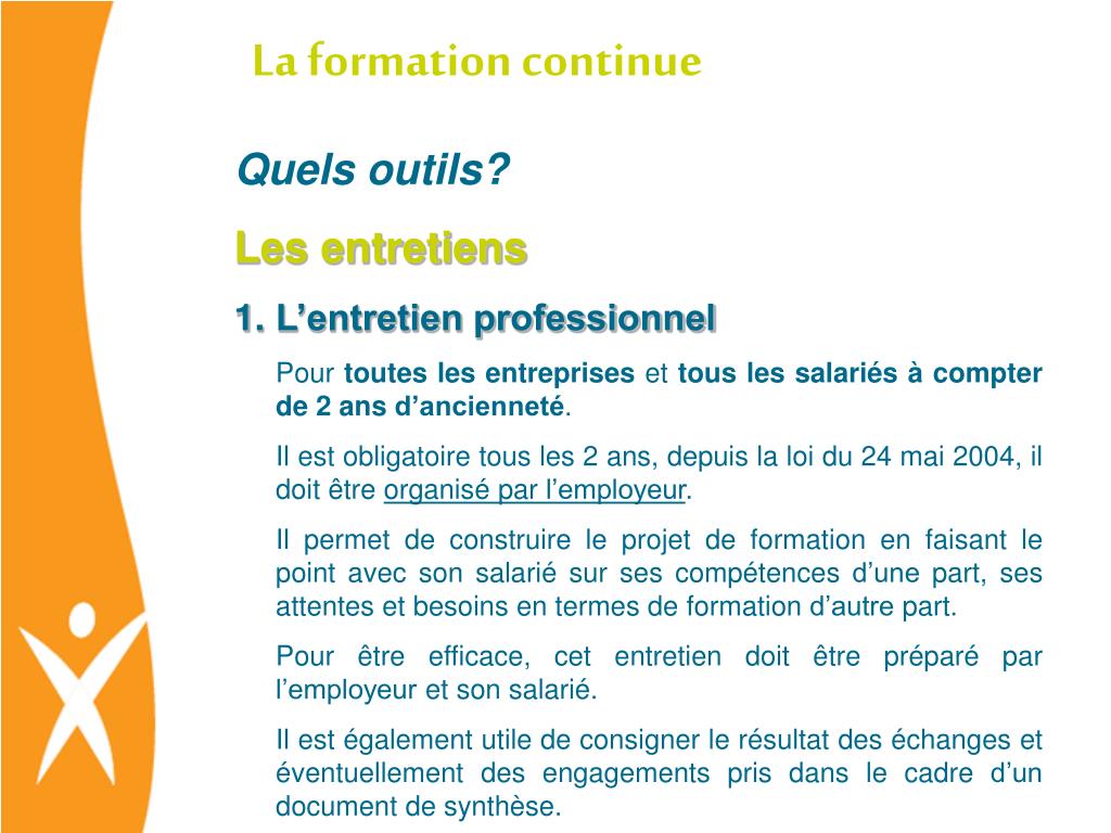 La formation continue • Quels outils? • Les entretiens • L’entretien professionnel • Pour toutes les entreprises et tous les salariés à compter de 2 ans d’ancienneté. • Il est obligatoire tous les 2 ans, depuis la loi du 24 mai 2004, il doit être organisé par l’employeur. • Il permet de construire le projet de formation en faisant le point avec son salarié sur ses compétences d’une part, ses attentes et besoins en termes de formation d’autre part. • Pour être efficace, cet entretien doit être préparé par l’employeur et son salarié. • Il est également utile de consigner le résultat des échanges et éventuellement des engagements pris dans le cadre d’un document de synthèse.