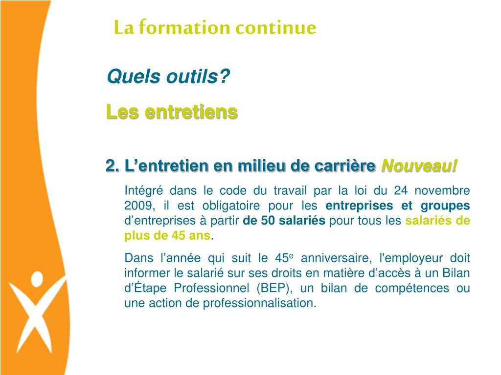 La formation continue • Quels outils? • Les entretiens • L’entretien en milieu de carrière Nouveau! • Intégré dans le code du travail par la loi du 24 novembre 2009, il est obligatoire pour les entreprises et groupes d’entreprises à partir de 50 salariés pour tous les salariés de plus de 45 ans. • Dans l’année qui suit le 45e anniversaire, l'employeur doit informer le salarié sur ses droits en matière d’accès à un Bilan d’Étape Professionnel (BEP), un bilan de compétences ou une action de professionnalisation.
