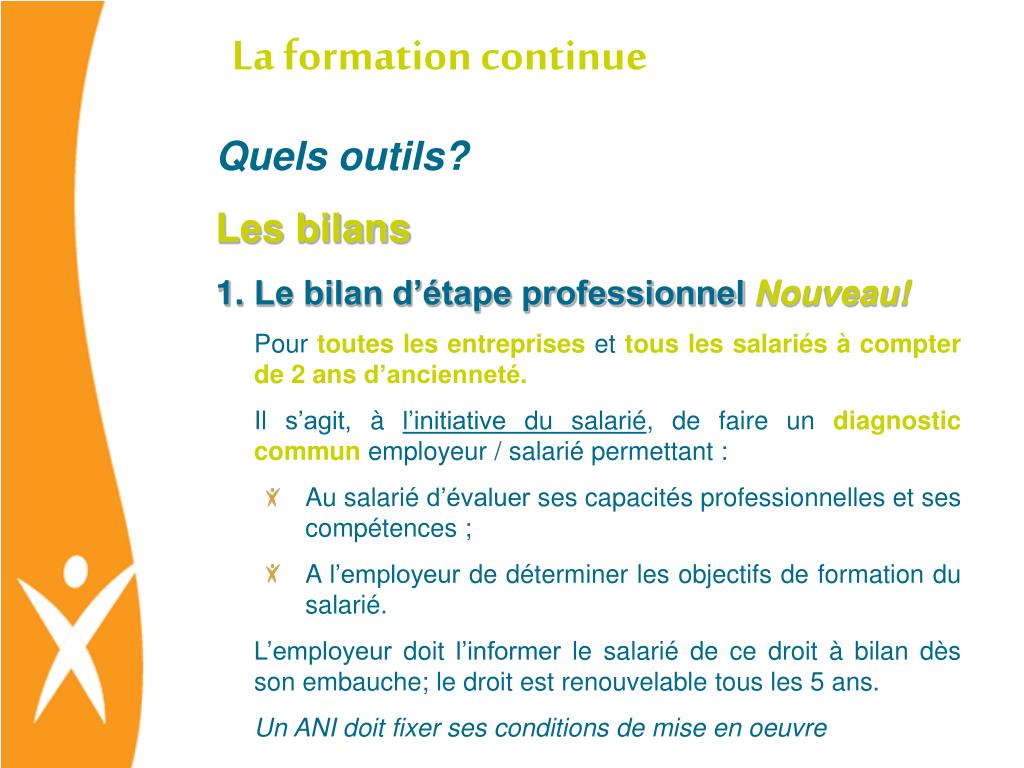 La formation continue • Quels outils? • Les bilans • Le bilan d’étape professionnel Nouveau! • Pour toutes les entreprises et tous les salariés à compter de 2 ans d’ancienneté. • Il s’agit, à l’initiative du salarié, de faire un diagnostic commun employeur / salarié permettant : • Au salarié d’évaluer ses capacités professionnelles et ses compétences ; • A l’employeur de déterminer les objectifs de formation du salarié. • L’employeur doit l’informer le salarié de ce droit à bilan dès son embauche; le droit est renouvelable tous les 5 ans. • Un ANI doit fixer ses conditions de mise en oeuvre
