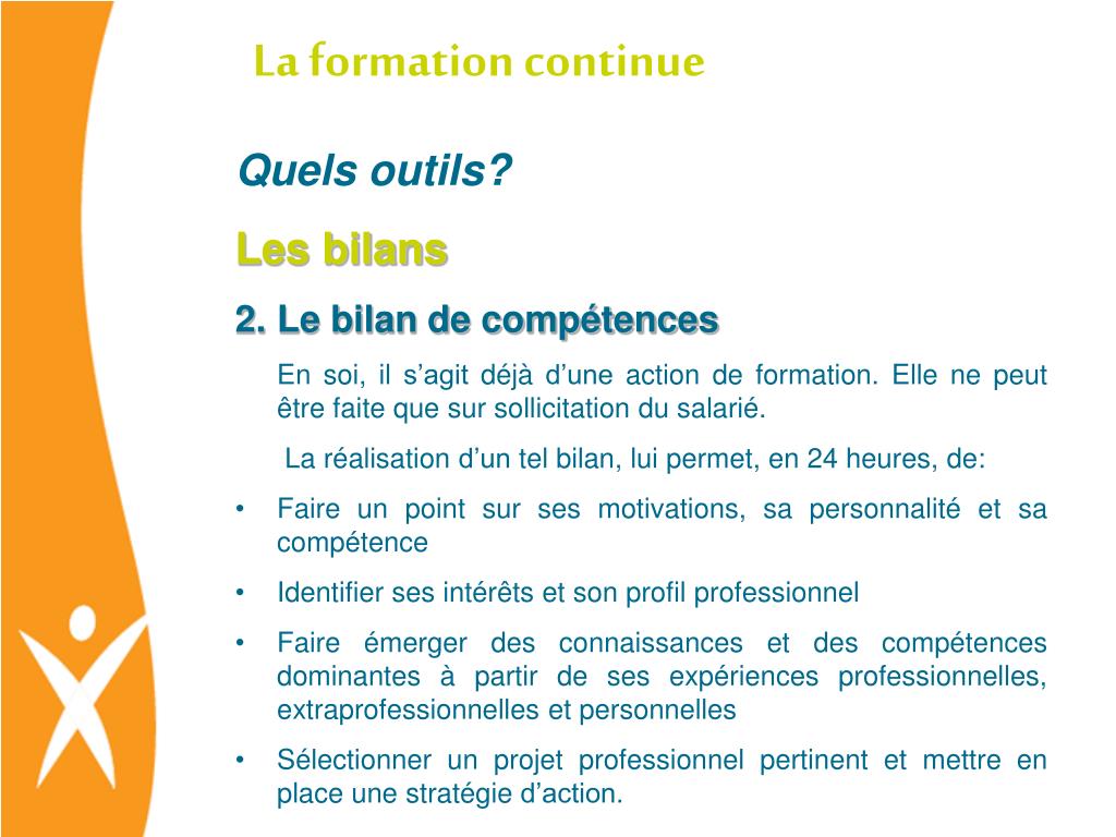 La formation continue • Quels outils? • Les bilans • Le bilan de compétences • En soi, il s’agit déjà d’une action de formation. Elle ne peut être faite que sur sollicitation du salarié. • La réalisation d’un tel bilan, lui permet, en 24 heures, de: • Faire un point sur ses motivations, sa personnalité et sa compétence • Identifier ses intérêts et son profil professionnel • Faire émerger des connaissances et des compétences dominantes à partir de ses expériences professionnelles, extraprofessionnelles et personnelles • Sélectionner un projet professionnel pertinent et mettre en place une stratégie d’action.