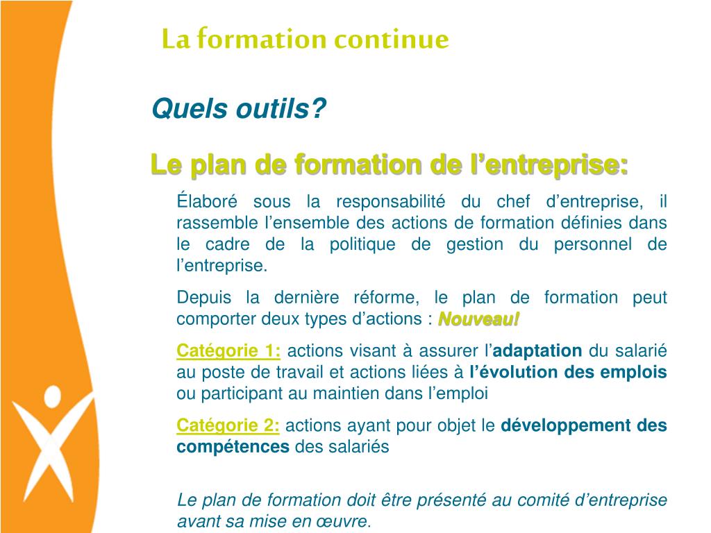 La formation continue Quels outils? Le plan de formation de l’entreprise: Élaboré sous la responsabilité du chef d’entreprise, il rassemble l’ensemble des actions de formation définies dans le cadre de la politique de gestion du personnel de l’entreprise. Depuis la dernière réforme, le plan de formation peut comporter deux types d’actions : Nouveau! Catégorie 1: actions visant à assurer l’adaptation du salarié au poste de travail et actions liées à l’évolution des emplois ou participant au maintien dans l’emploi Catégorie 2: actions ayant pour objet le développement des compétences des salariés Le plan de formation doit être présenté au comité d’entreprise avant sa mise en œuvre.