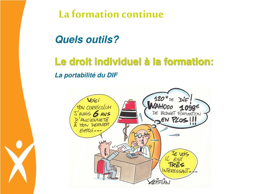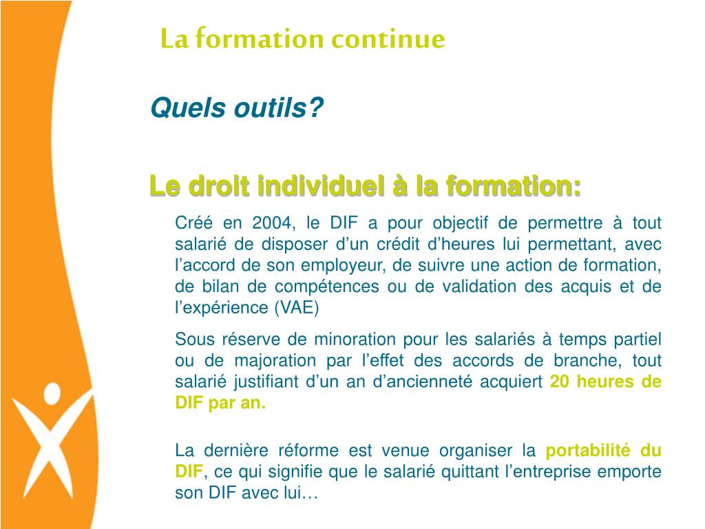 La formation continue Quels outils? Le droit individuel à la formation: Créé en 2004, le DIF a pour objectif de permettre à tout salarié de disposer d’un crédit d’heures lui permettant, avec l’accord de son employeur, de suivre une action de formation, de bilan de compétences ou de validation des acquis et de l’expérience (VAE) Sous réserve de minoration pour les salariés à temps partiel ou de majoration par l’effet des accords de branche, tout salarié justifiant d’un an d’ancienneté acquiert 20 heures de DIF par an. La dernière réforme est venue organiser la portabilité du DIF, ce qui signifie que le salarié quittant l’entreprise emporte son DIF avec lui…