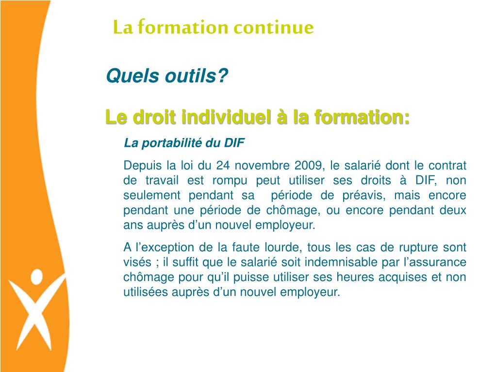 La formation continue Quels outils? Le droit individuel à la formation: La portabilité du DIF Depuis la loi du 24 novembre 2009, le salarié dont le contrat de travail est rompu peut utiliser ses droits à DIF, non seulement pendant sa période de préavis, mais encore pendant une période de chômage, ou encore pendant deux ans auprès d’un nouvel employeur. A l’exception de la faute lourde, tous les cas de rupture sont visés ; il suffit que le salarié soit indemnisable par l’assurance chômage pour qu’il puisse utiliser ses heures acquises et non utilisées auprès d’un nouvel employeur.