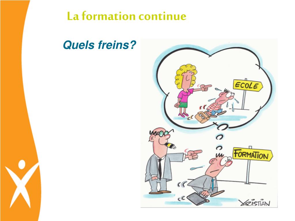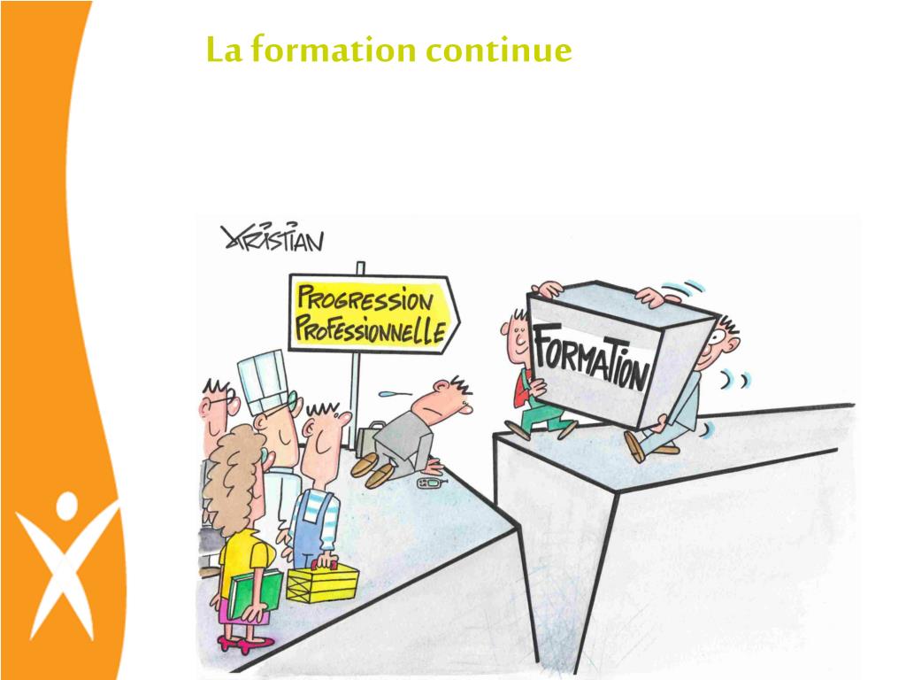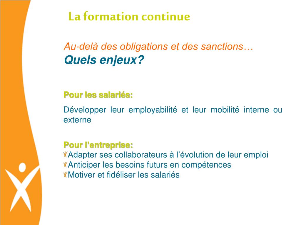 La formation continue • Au-delà des obligations et des sanctions… Quels enjeux? • Pour les salariés: • Développer leur employabilité et leur mobilité interne ou externe • Pour l’entreprise: • Adapter ses collaborateurs à l’évolution de leur emploi • Anticiper les besoins futurs en compétences • Motiver et fidéliser les salariés