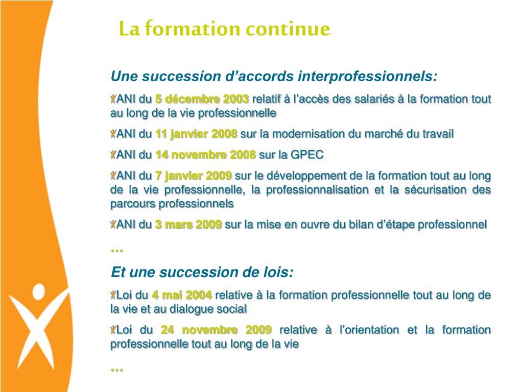 La formation continue • Une succession d’accords interprofessionnels: • ANI du 5 décembre 2003 relatif à l’accès des salariés à la formation tout au long de la vie professionnelle • ANI du 11 janvier 2008 sur la modernisation du marché du travail • ANI du 14 novembre 2008 sur la GPEC • ANI du 7 janvier 2009 sur le développement de la formation tout au long de la vie professionnelle, la professionnalisation et la sécurisation des parcours professionnels • ANI du 3 mars 2009 sur la mise en ouvre du bilan d’étape professionnel • … • Et une succession de lois: • Loi du 4mai 2004 relative à la formation professionnelle tout au long de la vie et au dialogue social • Loi du 24 novembre 2009 relative à l’orientation et la formation professionnelle tout au long de la vie • …