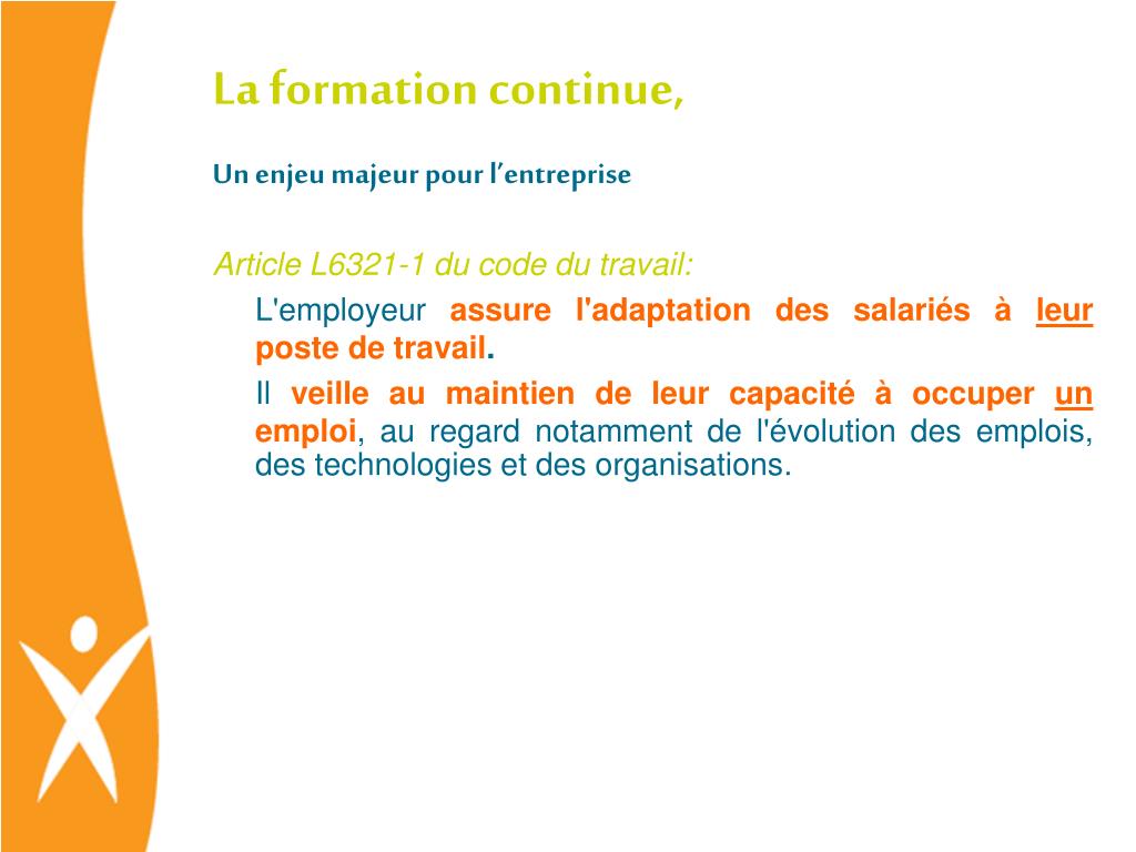 La formation continue, Un enjeu majeur pour l’entreprise Article L6321-1 du code du travail: L'employeur assurel'adaptation des salariés à leur poste de travail. Il veille au maintien de leur capacité à occuper un emploi, au regard notamment de l'évolution des emplois, des technologies et des organisations.