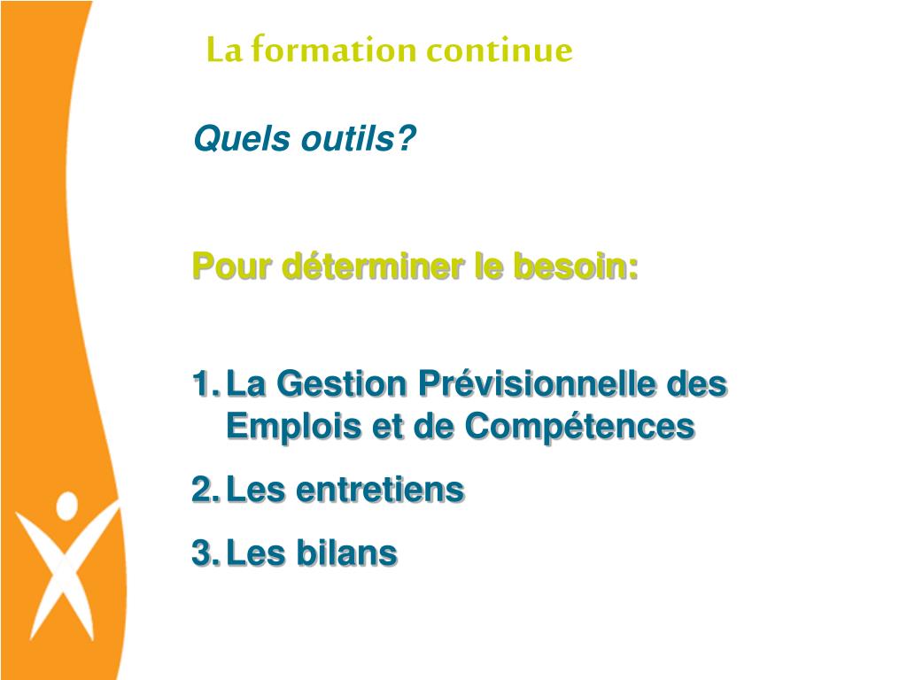 La formation continue • Quels outils? • Pour déterminer le besoin: • La Gestion Prévisionnelle des Emplois et de Compétences • Les entretiens • Les bilans