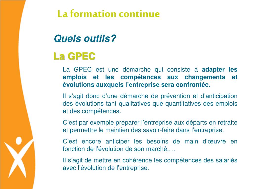 La formation continue Quels outils? La GPEC La GPEC est une démarche qui consiste à adapter les emplois et les compétences aux changements et évolutions auxquels l’entreprise sera confrontée. Il s’agit donc d’une démarche de prévention et d’anticipation des évolutions tant qualitatives que quantitatives des emplois et des compétences. C’est par exemple préparer l’entreprise aux départs en retraite et permettre le maintien des savoir-faire dans l’entreprise. C’est encore anticiper les besoins de main d’œuvre en fonction de l’évolution de son marché,… Il s’agit de mettre en cohérence les compétences des salariés avec l’évolution de l’entreprise.