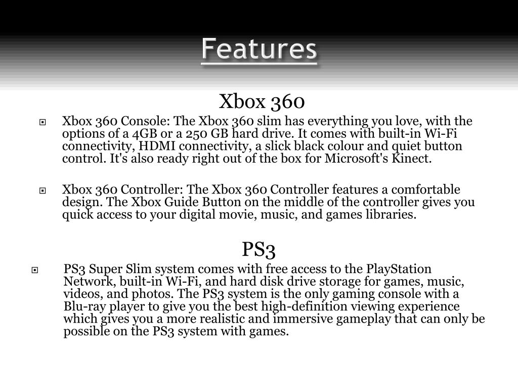 Features Xbox 360 • Xbox 360 Console: The Xbox 360 slim has everything you love, with the options of a 4GB or a 250 GB hard drive. It comes with built-in Wi-Fi connectivity, HDMI connectivity, a slick black colour and quiet button control. It's also ready right out of the box for Microsoft's Kinect. • Xbox 360 Controller: The Xbox 360 Controller features a comfortable design. The Xbox Guide Button on the middle of the controller gives you quick access to your digital movie, music, and games libraries. PS3 • PS3 Super Slim system comes with free access to the PlayStation Network, built-in Wi-Fi, and hard disk drive storage for games, music, videos, and photos. The PS3 system is the only gaming console with a Blu-ray player to give you the best high-definition viewing experience which gives you a more realistic and immersive gameplay that can only be possible on the PS3 system with games.